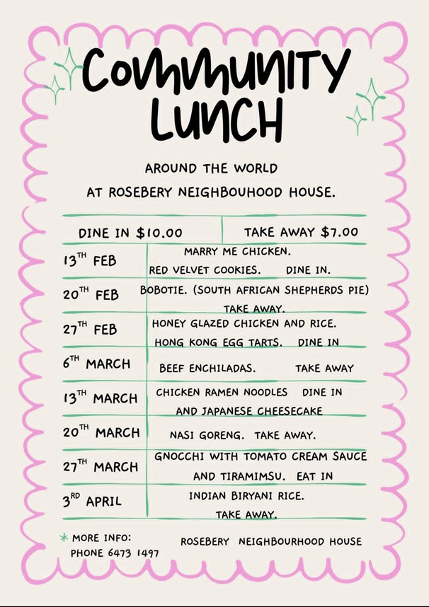 Rosebery Community House is excited to welcome back their much-loved Community Lunches, with this year’s delicious theme being “Around the World”!