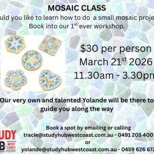 Mosaic Class – Study Hub West Coast Would you like to learn how to do a small mosaic project? The Study Hub West Coast are holding their... 21 Mar 11:30 am - 3:30 pm Study Hub West Coast Frederick Street, Zeehan