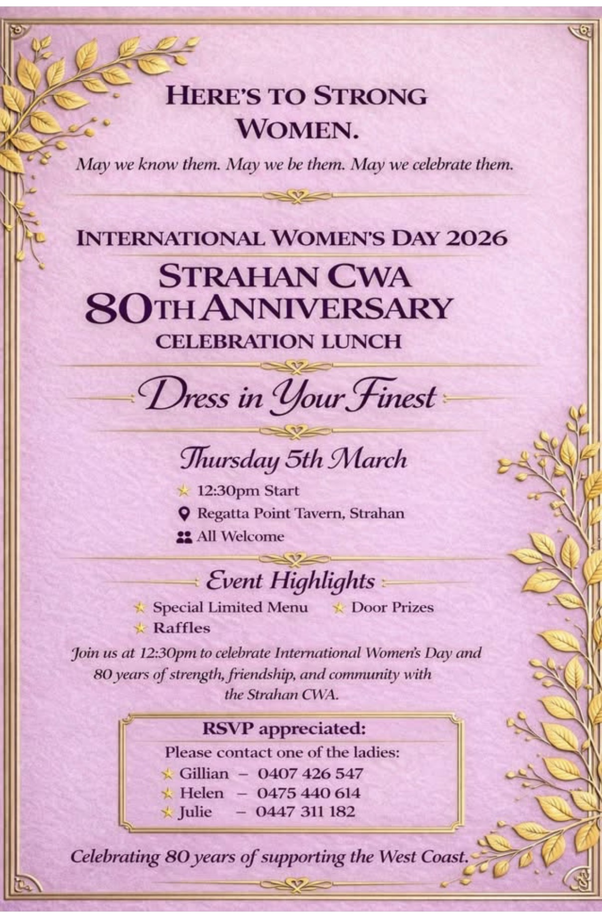 The Strahan CWA are combining their 80th anniversary celebration luncheon with International Women’s Day, on Thursday the 5th of March at 12:30pm. The luncheon will be held at the Regatta Point Tavern in Strahan.